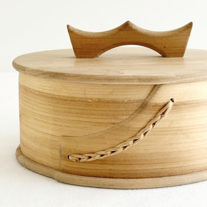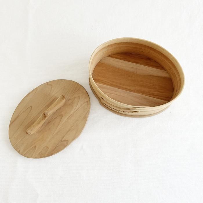 いわゆる曲木でかたちを作っており、一周した板を樹木の根で編んでとめ、